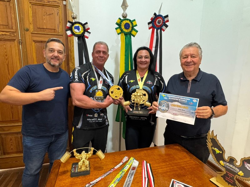 Rodrigo e Luciana Mesquita foram recebidos pelo prefeito Irineu Maretto após conquistarem o topo no Mr. Olympia World Championship, em São Paulo