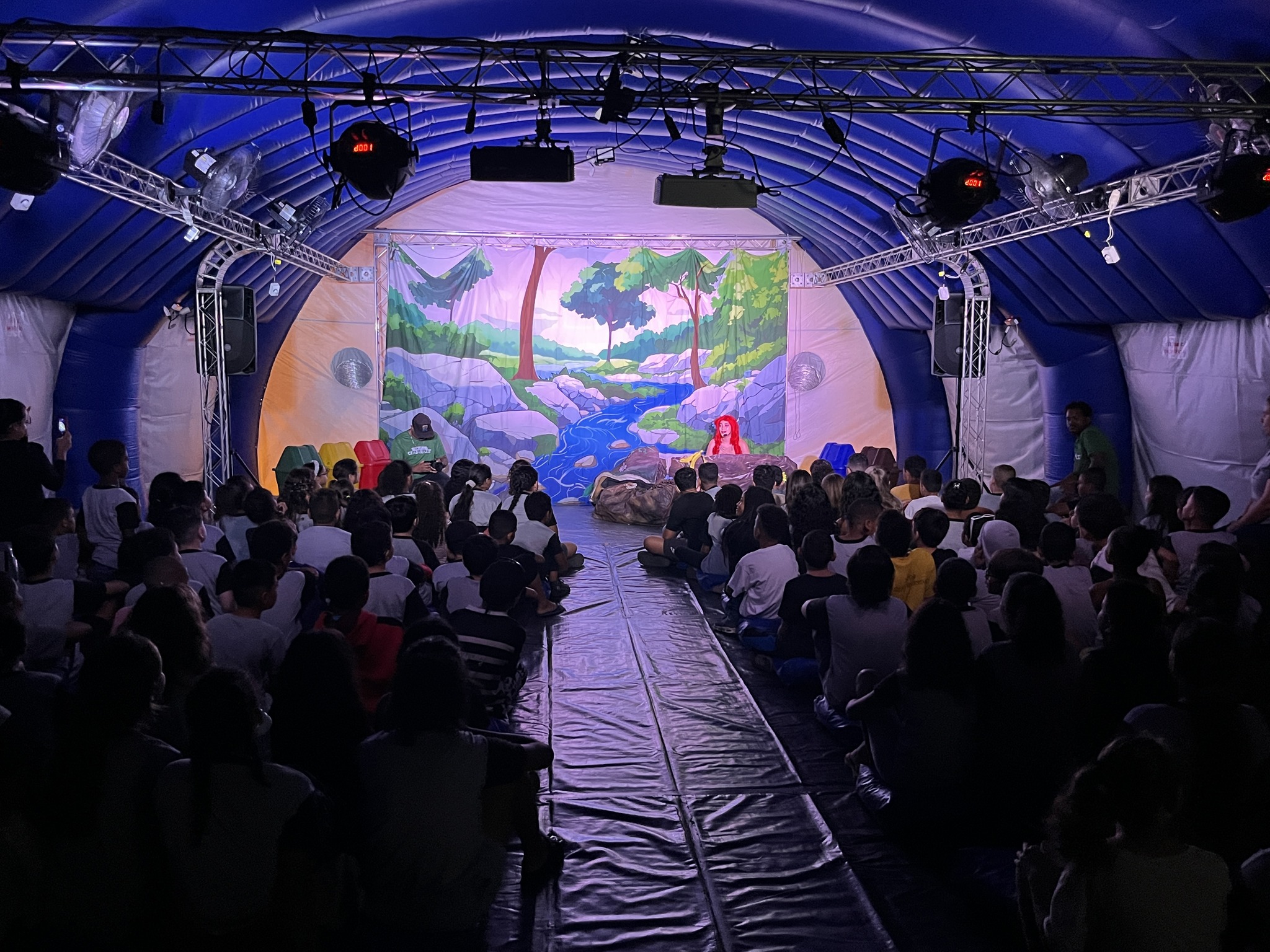 Projeto itinerante promove sessões de cinema e teatro com temas de conscientização ambiental e social na escola municipal
