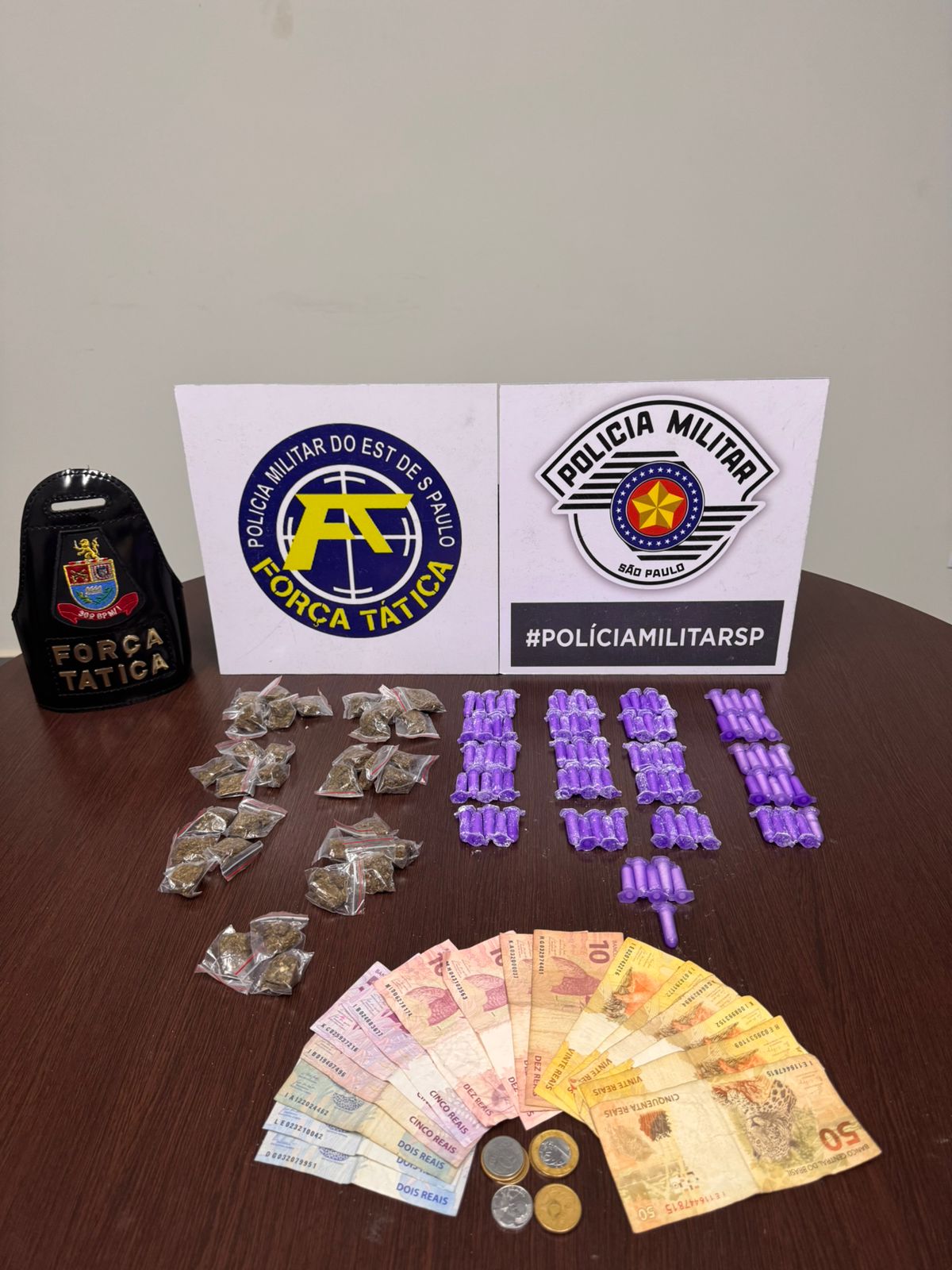 Suspeitos foram flagrados com porções de cocaína e dinheiro durante patrulhamento da Força Tática da Polícia Militar