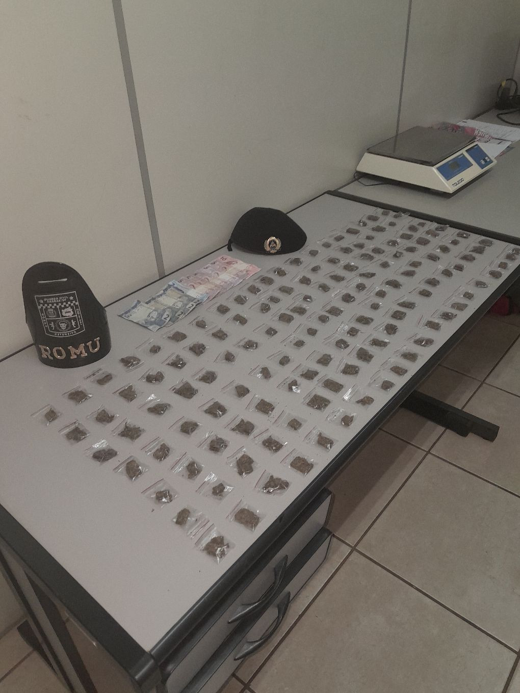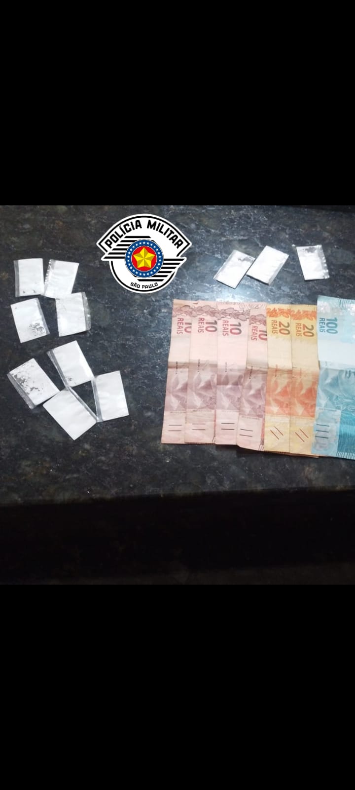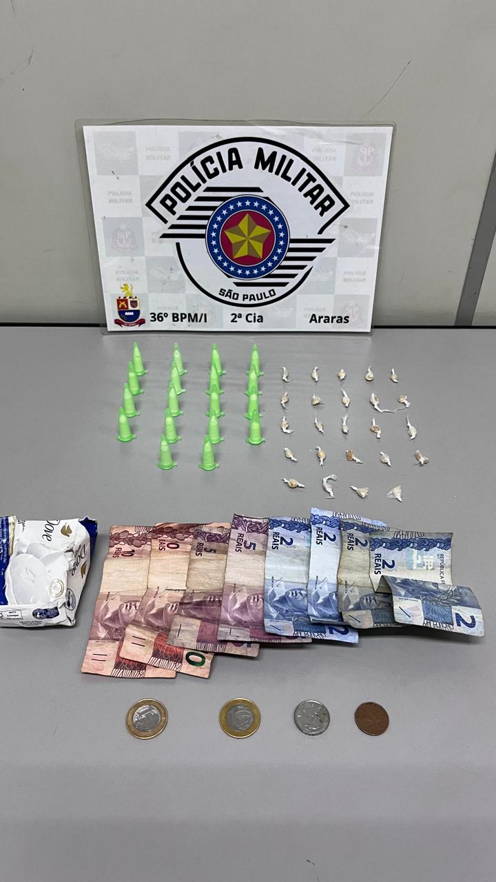 Com a suspeita, foram encontrados pinos de cocaína, pedras de crack e dinheiro em espécie; ela confessou o crime e segue à disposição da Justiça