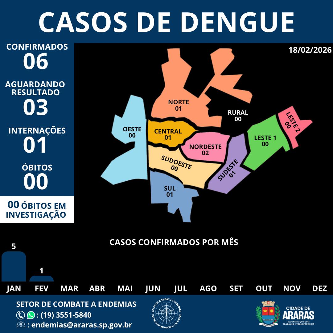Dados atualizados em 18 de fevereiro de 2026 são do Setor de Combate a Endemias da Prefeitura de Araras