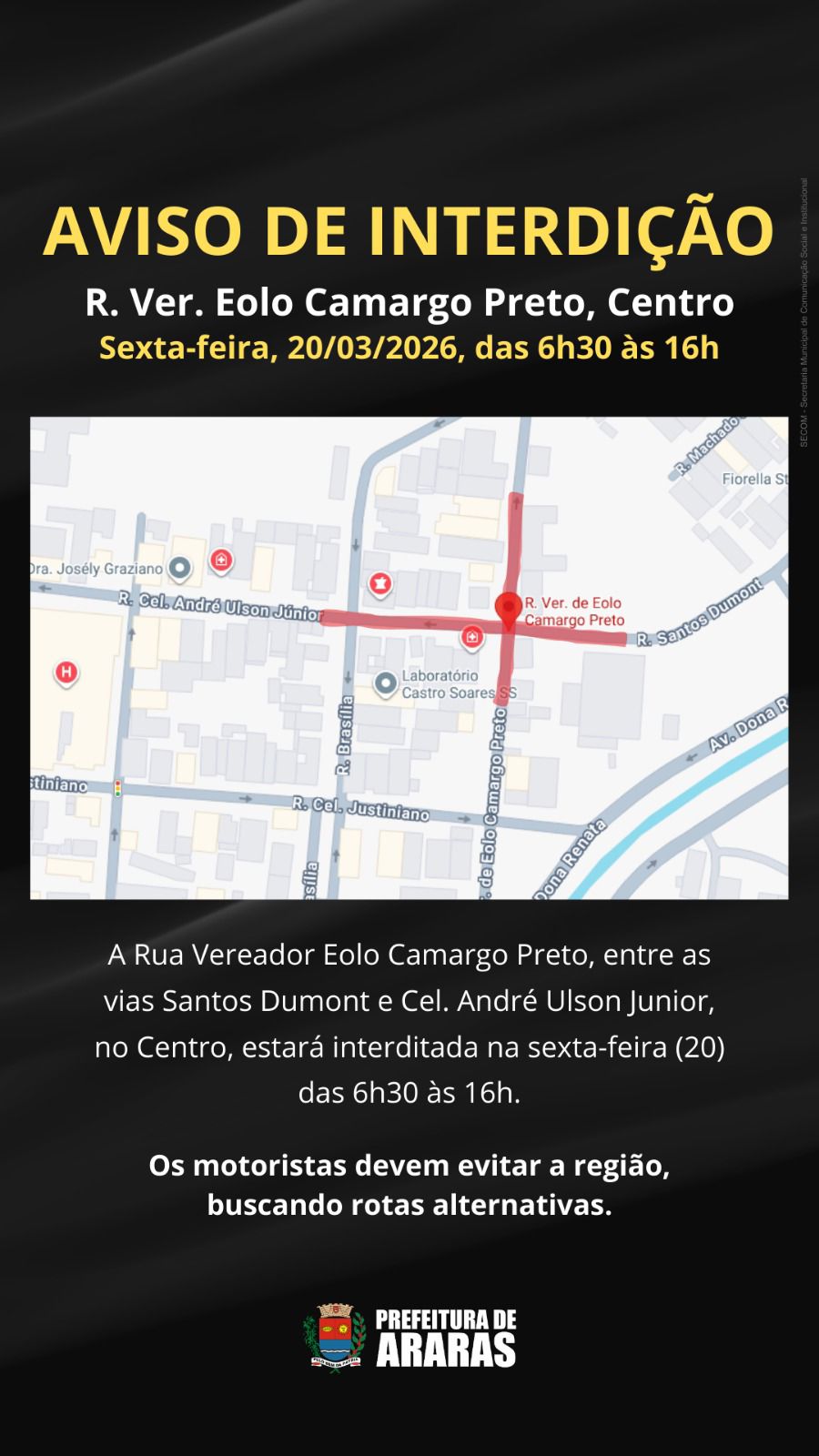 Interdição temporária altera trânsito no Centro de Araras nesta sexta-feira (20)