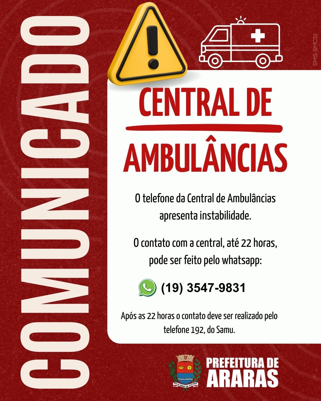 Central de ambulâncias enfrenta instabilidade e altera forma de contato em Araras