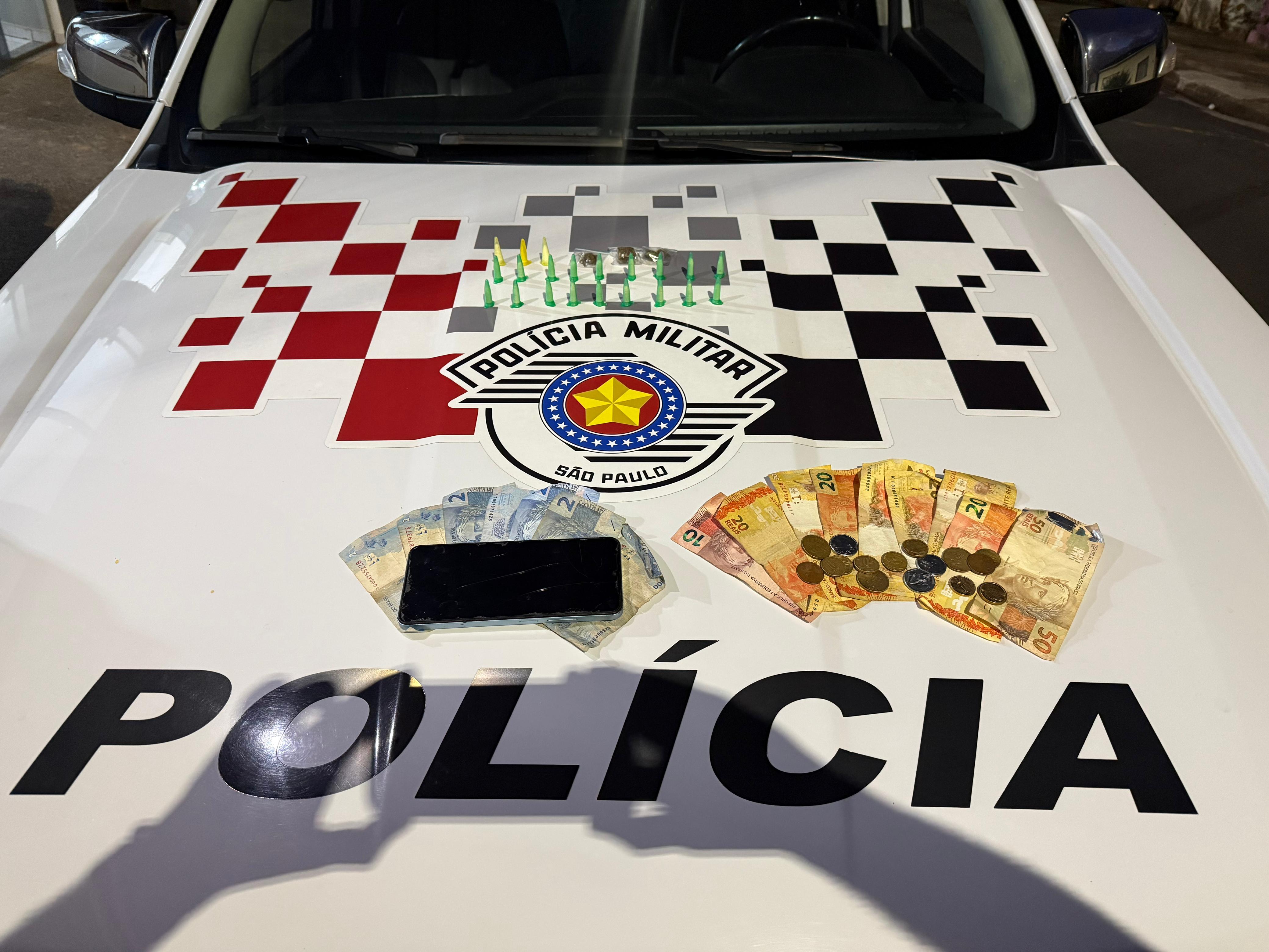 Ação da Polícia Militar ocorreu no Jardim Cavinato e resultou na apreensão de entorpecentes, dinheiro e um celular
